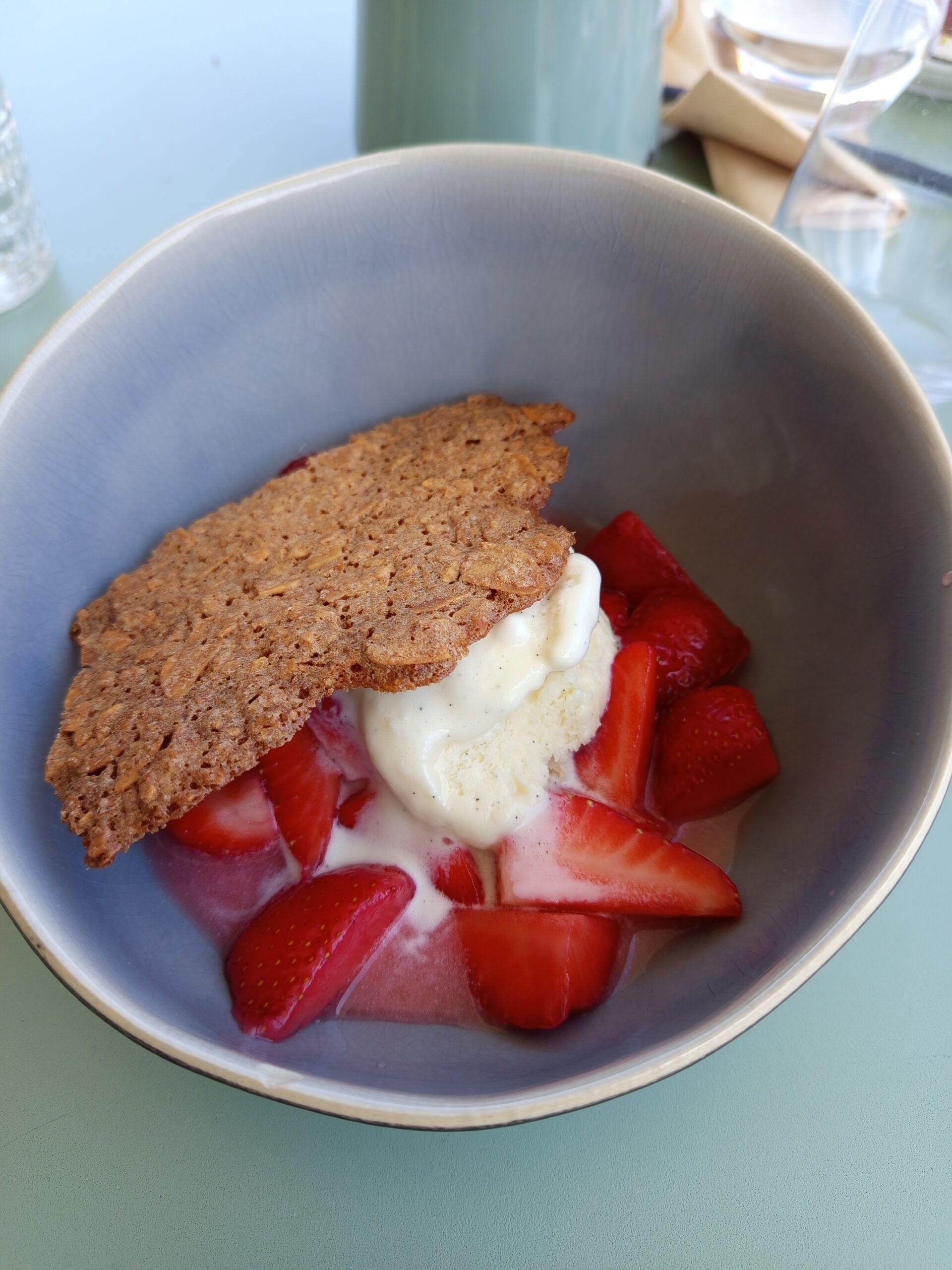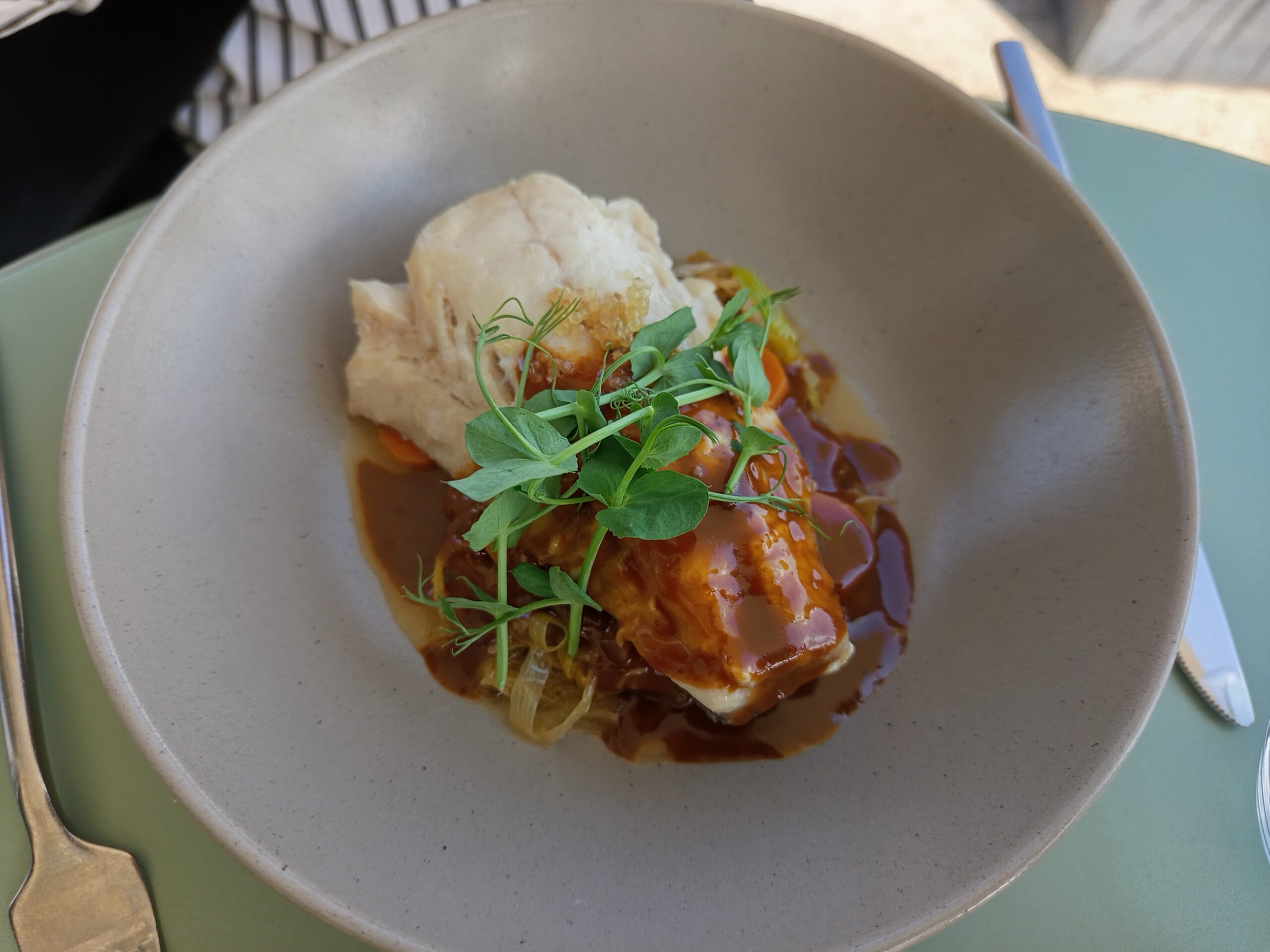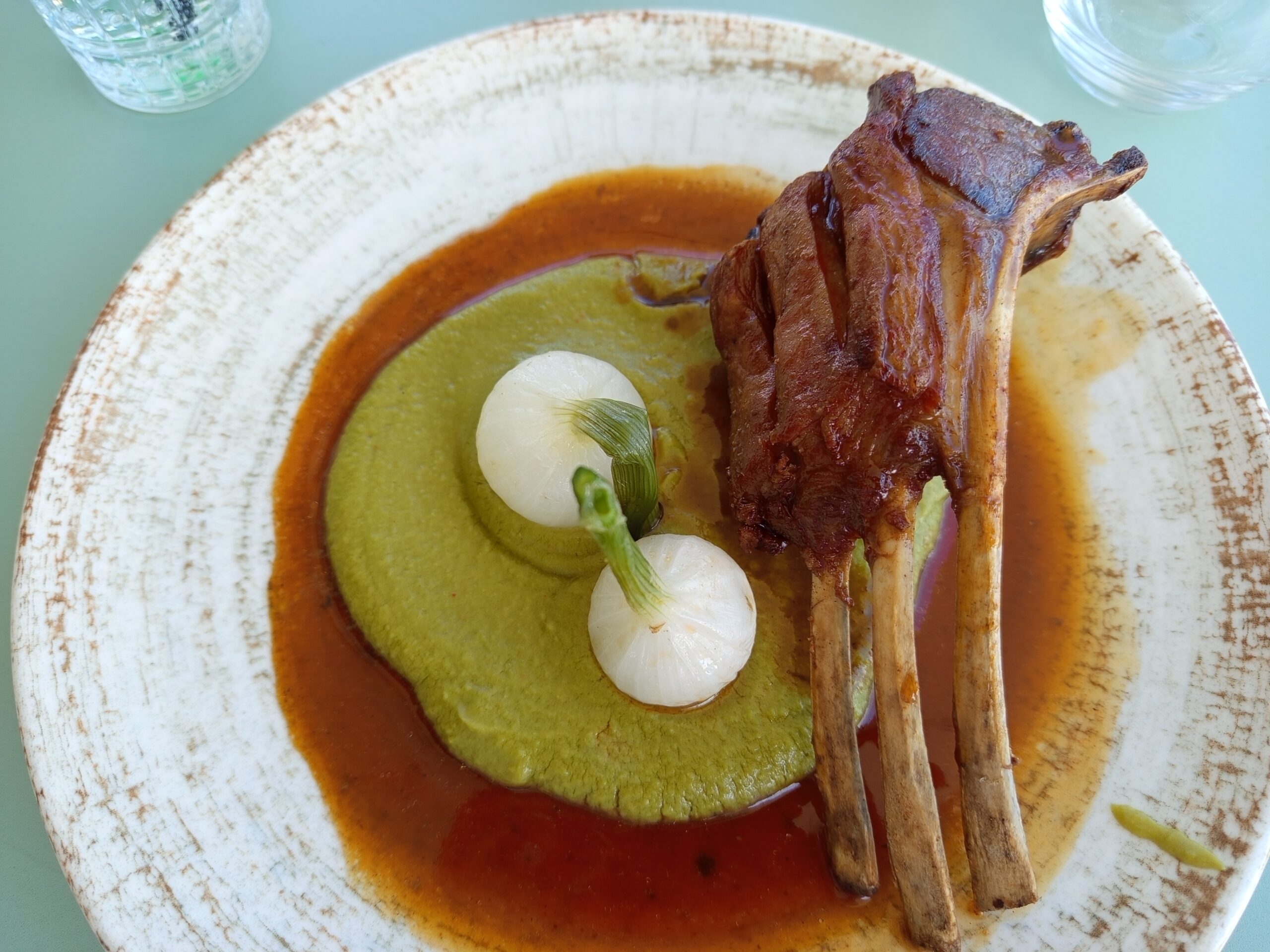 Un plat simple mais parfaitement maîtrisé : des côtes d’agneau, tendres à souhait, déposées sur un lit de purée de petits pois. Un équilibre de saveurs, une cuisson parfaite… et cette touche de fraîcheur qui te fait dire “ok, là, ils savent y faire”.